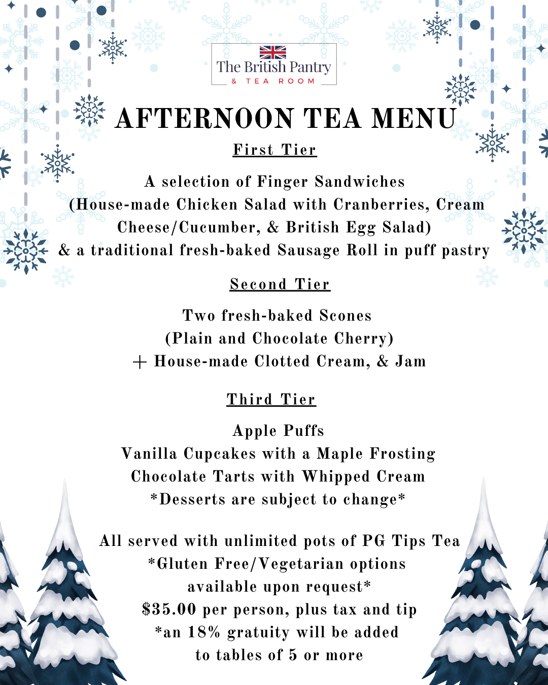 Indulge in the timeless tradition of High Tea with our authentic and elegant experience. Our High Tea is a feast for the senses, featuring a selection of delicate finger sandwiches, freshly baked scones with clotted cream and jam, a freshly baked sausage roll, and three desserts per person presented on a 3 tier tray. We add Friday service in our Tea Room during December.